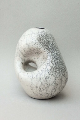 Creating the “PEBBLES” series, I drew inspiration from the shape and texture of smooth seaside stones I found on the beach. The piece was glazed and fired in a raku kiln, where the fire and smoke created unique patterns on its surface.